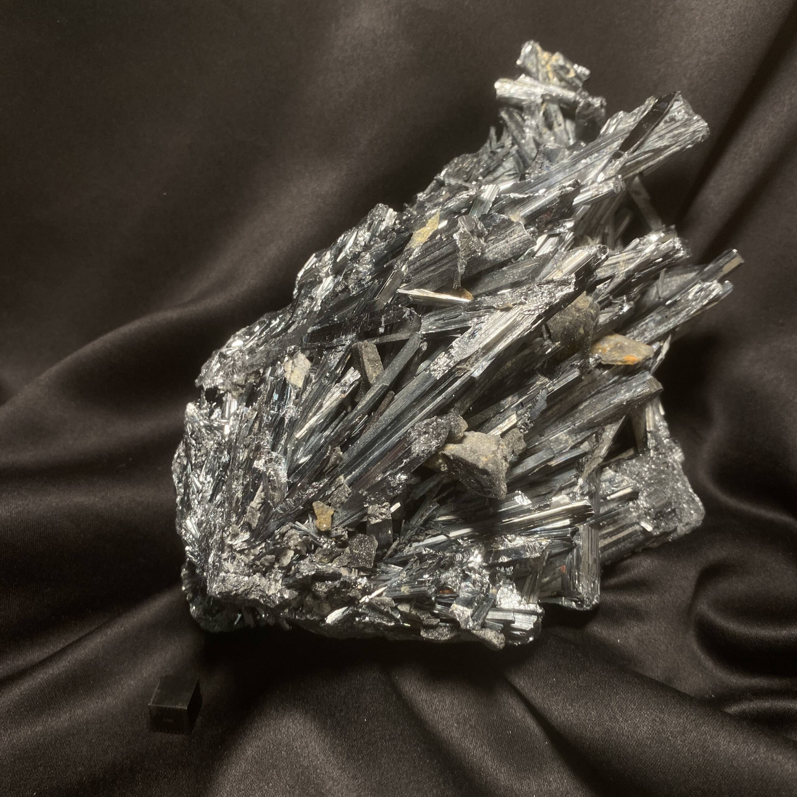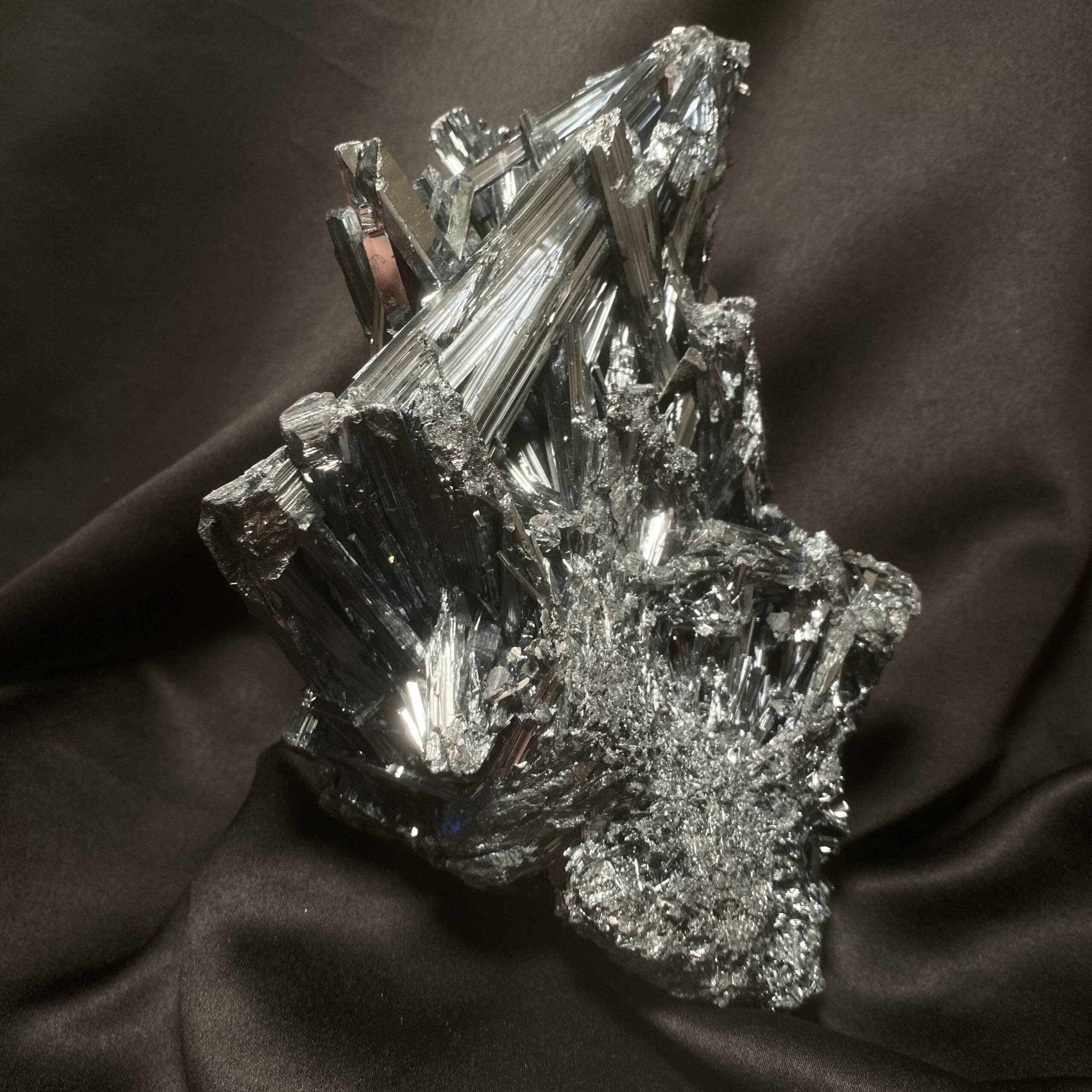 Cristaux prismatiques de Stibine en groupes radiaires. Cristaux striés longitudinalement.